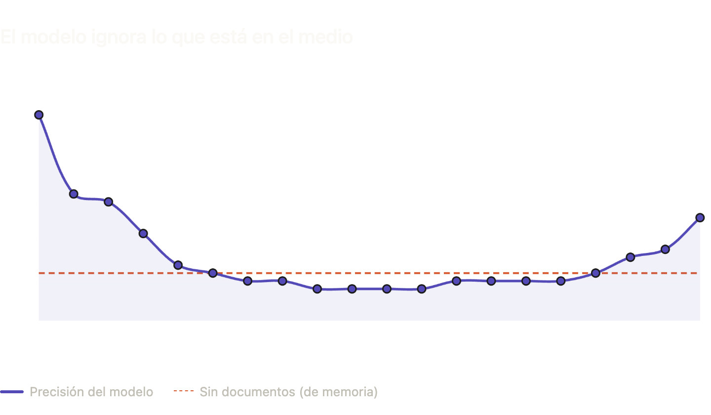 En un paper, le dieron a una LLM 20 documentos y una consulta. Solo 1 de los documentos tenía la respuesta correcta, pero la posición del documento iba cambiando.