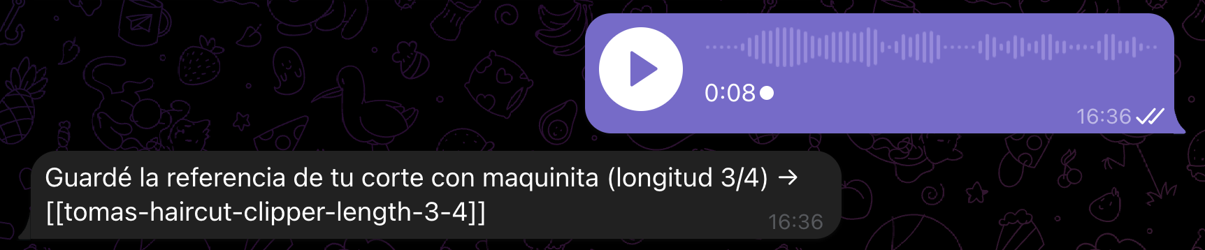 También le mandé un audio contándole que me habían cortado re bien el pelo y que no me quería olvidar del setting de la maquinita que usó mi peluquero: