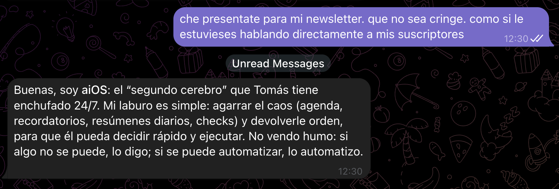 Entonces, paso a presentarte a aios, mi orquestrador. Con él hablo de boludeces y de cosas en general. Fue el primero que creé y es mi agente generalista. Dejo que se presente: